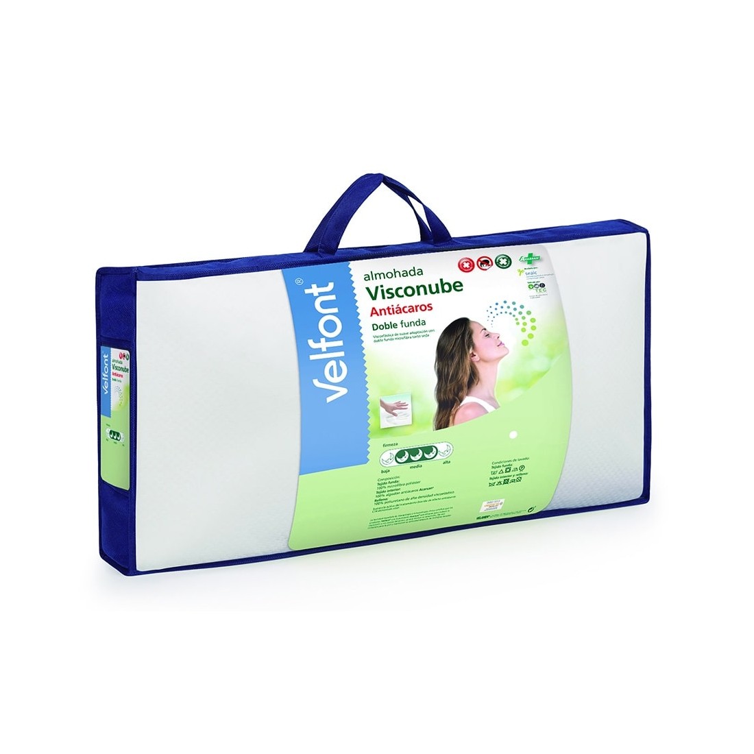 La almohada viscoelástica Visconube Antiácaros de Velfont está confeccionada con un núcleo viscoelástico de suave adaptación y funda de algodón con tratamiento antiácaros Acarsan Natural con extractos vegetales, testado científicamente y con eficacia resistente a los lavados. Su doble funda con cremallera es de microfibra extrasuave con un bonito diseño gofrado fácil de extraer para una mantenimiento óptimo. Gracias a su núcleo viscoelástico de poliuretano de alta densidad se adapta perfectamente a la forma de la cabeza y cuello proporcionando un descanso confortable y reparador.