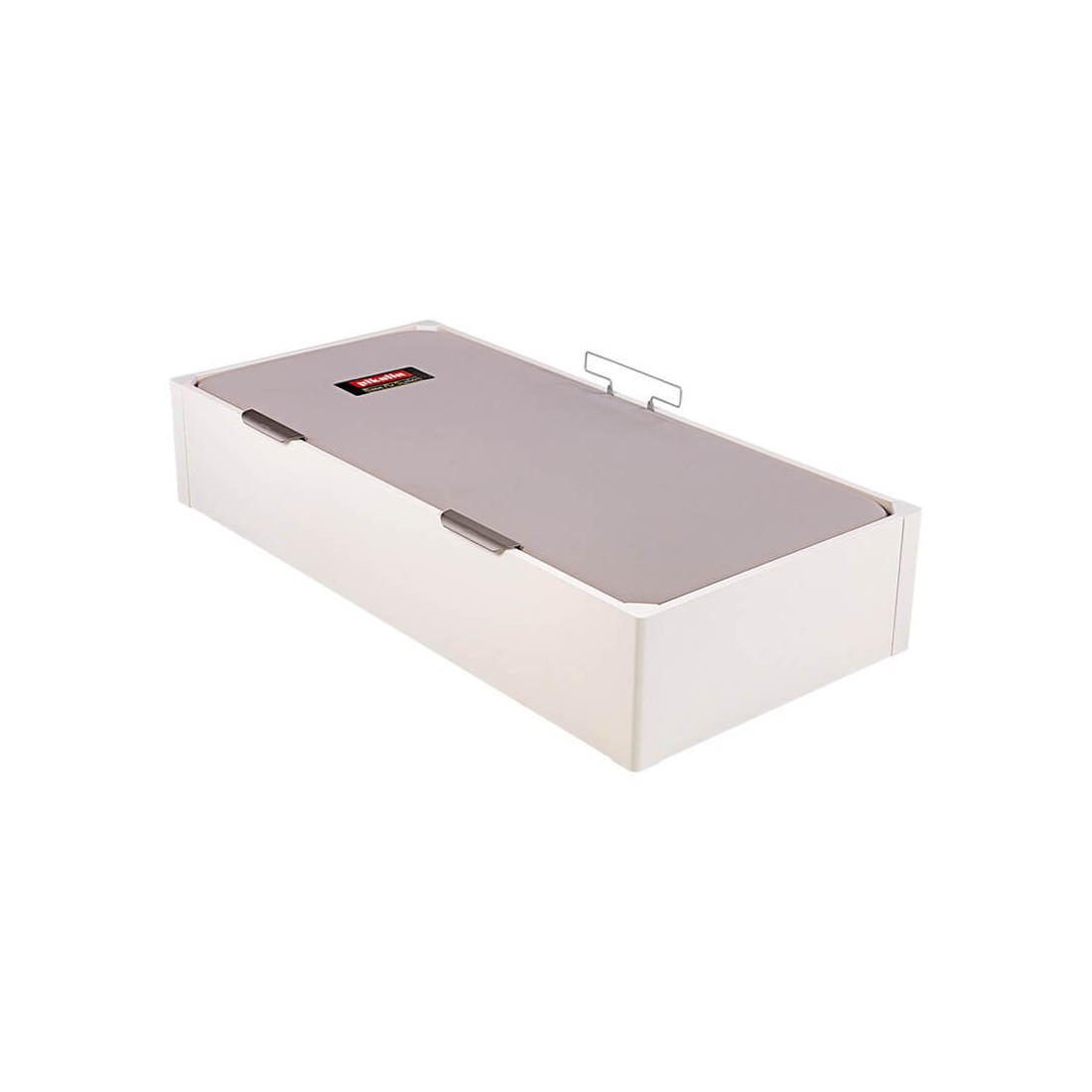 Canapé de sencilla apertura lateral mediante amortiguadores neumáticos y dos tiradores de aluminio anodizado. La tapa queda oculta dentro de la cubeta al cerrar el canapé de forma que no se percibe a la vista dándole un aspecto más sofisticado el dormitorio.