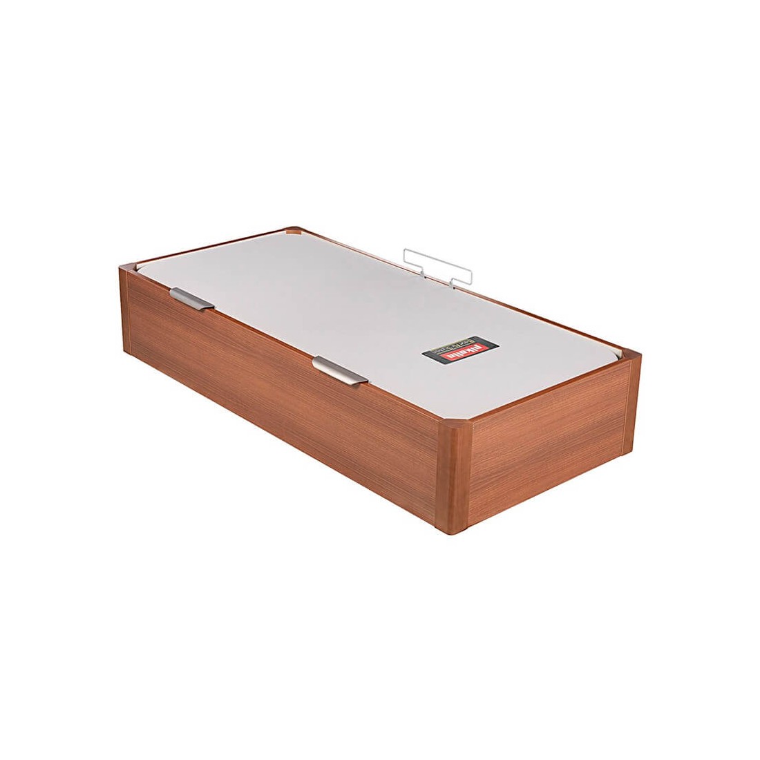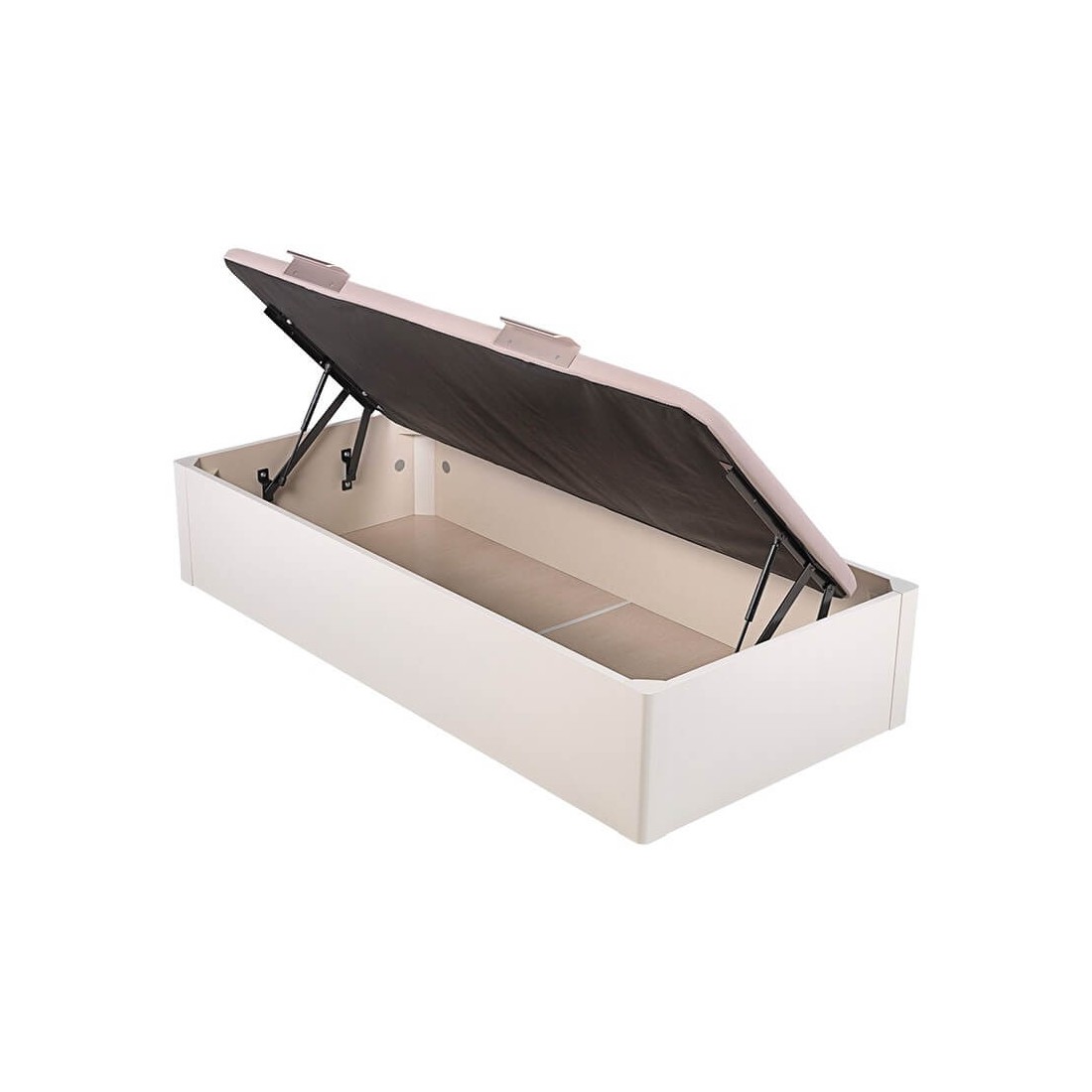 Canapé de sencilla apertura lateral mediante amortiguadores neumáticos y dos tiradores de aluminio anodizado. La tapa queda oculta dentro de la cubeta al cerrar el canapé de forma que no se percibe a la vista dándole un aspecto más sofisticado el dormitorio.