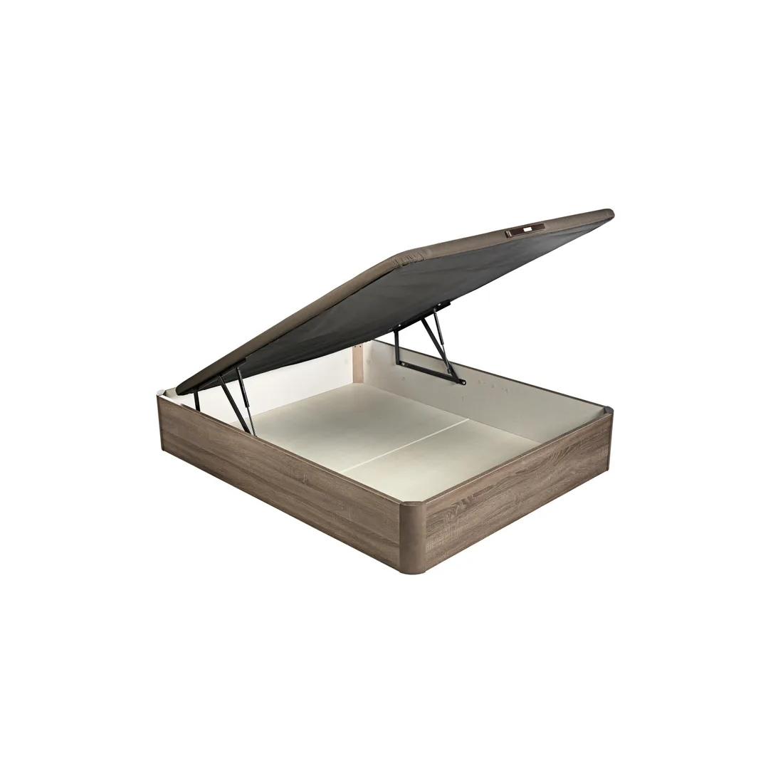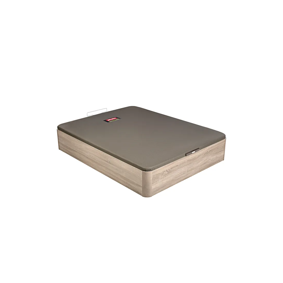 La cubeta está construida con laminados de 25 mm de espesor tanto en el interior como en el exterior. Sus cuatro esquinas de madera maciza añaden durabilidad y estabilidad. Posee en su diseño líneas rectas en el cabecero y curvas en el piecero para un acabado estéticamente mas atractivo. Este canapé cuenta con 36cm de altura al suelo de los cuales 30cm son integramente dedicados a almacenaje.