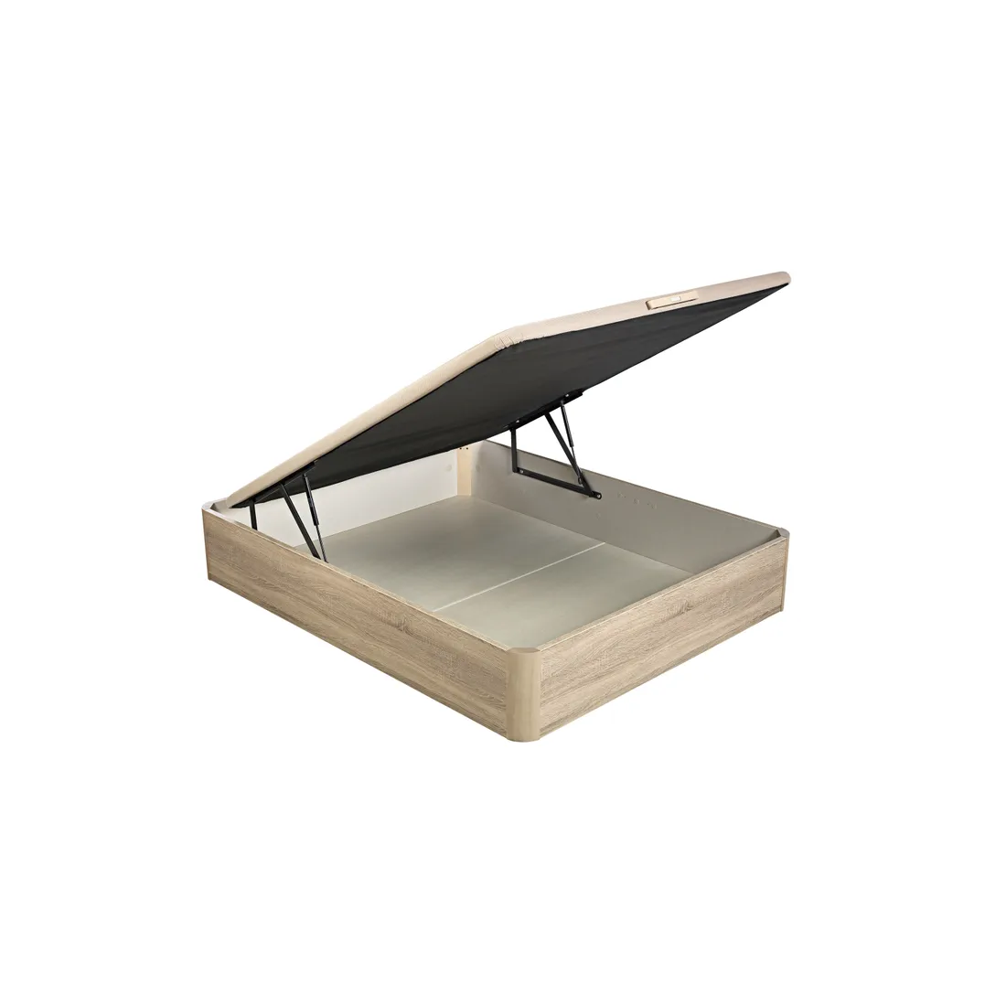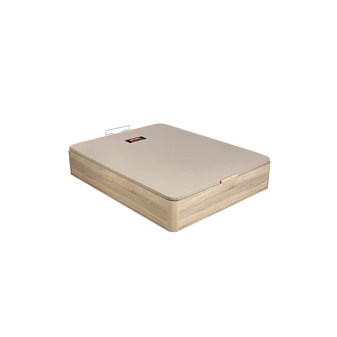 La cubeta está construida con laminados de 25 mm de espesor tanto en el interior como en el exterior. Sus cuatro esquinas de madera maciza añaden durabilidad y estabilidad. Posee en su diseño líneas rectas en el cabecero y curvas en el piecero para un acabado estéticamente mas atractivo. Este canapé cuenta con 36cm de altura al suelo de los cuales 30cm son integramente dedicados a almacenaje.